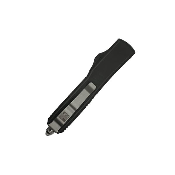 Double action OTF automatic knife. 3.5" 5CR13 stainless steel dagger blade. 5.25" closed. CNC black aluminum Handle.