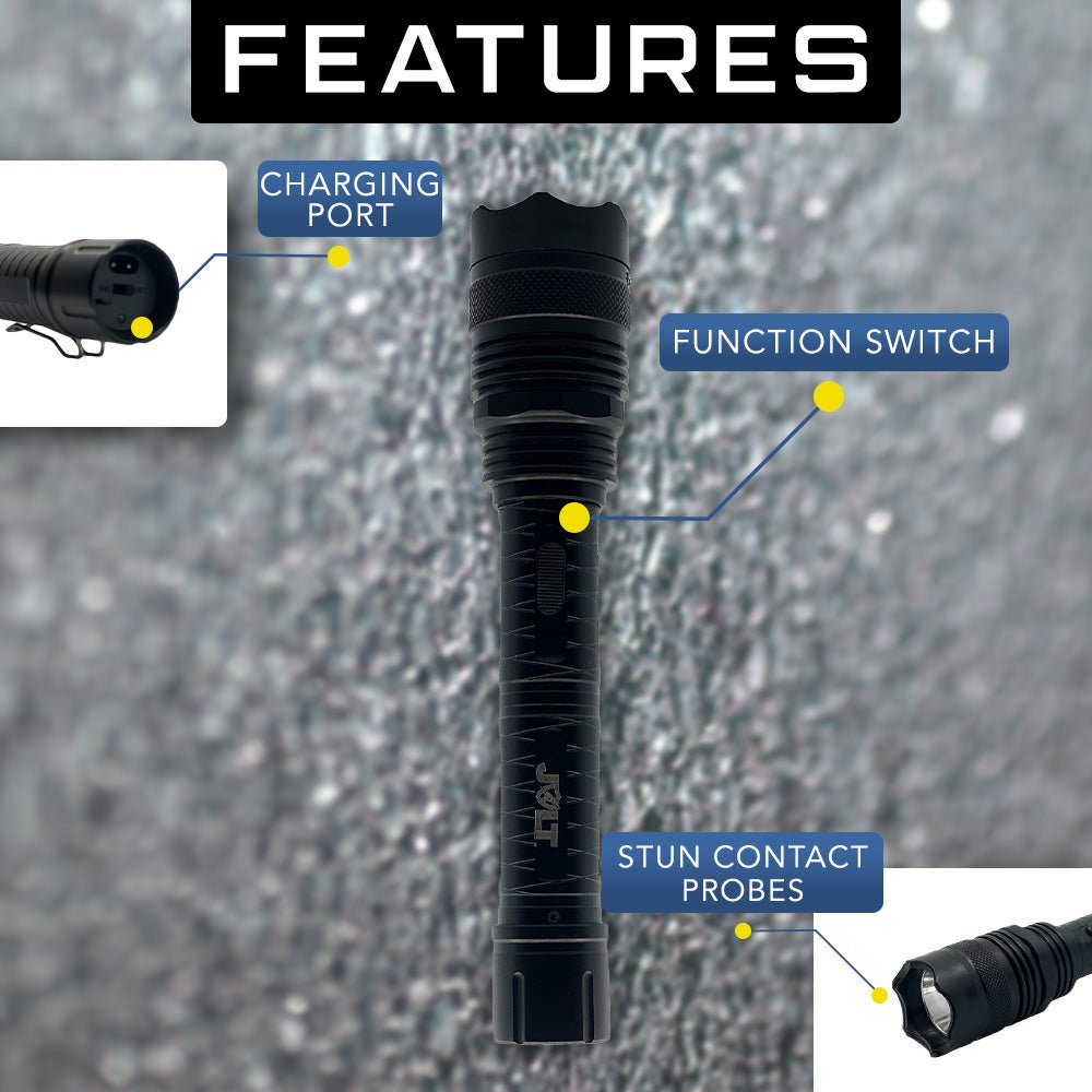 The JOLT Tactical 95,000,000* Stun Flashlight is made of military-grade aluminum alloy and is the perfect choice for those wanting a powerful stun gun flashlight at an economical price. At 9.5 inches long it is about the same size as a standard flashlight but gives you the added protection of a stun gun that packs a powerful punch if ever needed for self-defense.